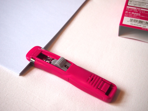 將本體開口處平穩地扣入這疊紙,推動灰色手柄,非常輕鬆地夾子就進去了。