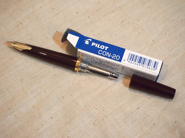 盒內一覽,本體、說明書、墨膽,筆有塑封,另自行配了 CON-20 的吸墨器。